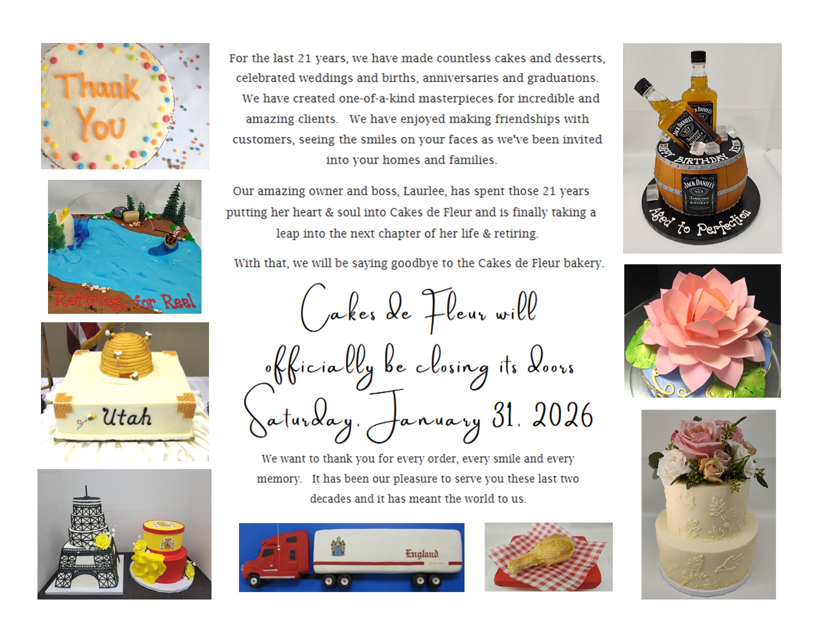 Custom cakes may require up to 2 weeks advance notice. Please call for availability.
